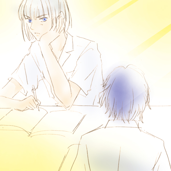イザーク、アスラン、ディアッカ、ラスティの同級生が、学校の図書室で自主勉。