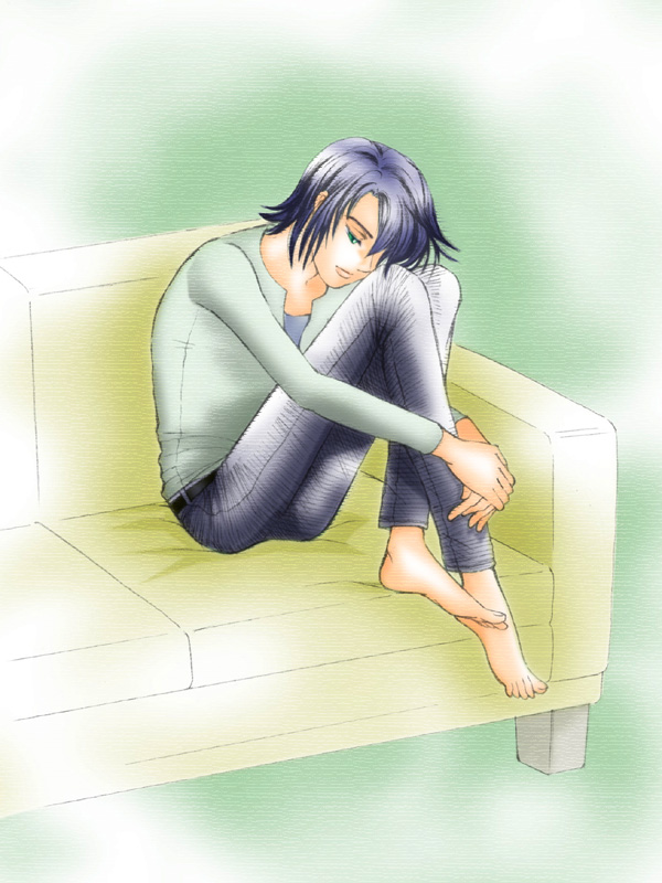 ソファーに座っていただこうと思ったら、俯いちゃった…。