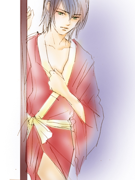 事後(←おい!)、乱れた緋襦袢の襟をかき合わせて、身体を清めに行こうと襖に手を掛ける姿を妄想して描きました。